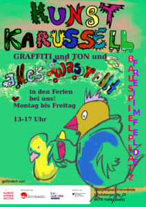In den Herbstferien gehts rund. Das KunstKarussell dreht sich wie ein Wirbelwind und wartet dabei mit einer ganzen Parlette Workshopangeboten auf. Unter dem Motto „alles was rollt“ gibt das KunstKarussell den Anstoß zum Bau von Seifenkisten. An diesen kann mit Hilfe des Bauspielplatzteams an den restlichen Ferientagen weiter gebaut werden. Denn dann geht die rasante Fahrt schon weiter mit Graffittikursen und nochmal zum heißersehnten Tonangebot zurück.